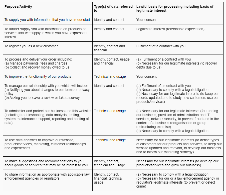 We have set out below, in a table format, a description of all the ways we plan to use your personal data, and what the proper and legal basis for each is, in accordance with applicable data protection legislation. We have also identified what our legitimate interests are wherever appropriate.